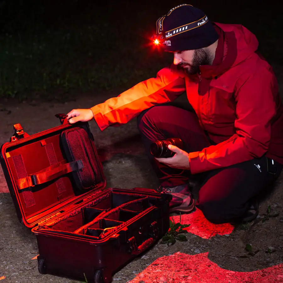 Den NYA pannlampan Fenix HM60R är inte bara kraftfull utan också smart. Fenix nya patenterade ljusteknik (Frequency Sensing Technology) känner av användarens steghastighet och anpassar ljuseffekten efter rörelsehastigheten HM60R producerar ett ljust maximalt ljusflöde på 1200 lumen och en ljusstråle som lyser upp hela området upp till en maximalt 116 meter. Fenix HM60R-lampan har ett multi-belysningssystem, som tillhandahålls av tre olika ljuskällor utmärkt belysning för alla behov. Den nya spotlighten som använder en dubbel ljusstråle lyser nu för första gången upp hela området upp till max 116 meter! Den separata halvljusstrålen erbjuder ultrabred närbelysning som effektivt lyser upp hela omgivningen. Lampans två röda lampor bevarar användarens syn i svagt ljus i mörker och kan även användas som en uppmärksamhet och nödljus . Denna lampa behöver inte fumlas eftersom alla funktioner enkelt manövreras från den stora tryckknappsomkopplaren som finns i änden av lampan. Lampan kan även användas med tjockare handskar. Fenix HM60R lat kom igång supersnabbt med den nya supersnabba USB C-laddningskontakten. HM60R har den snabbaste 5 V 1,5 A USB-C-laddningskontakten i sin klass, som snabbt laddar lampans batteri till fullt.
