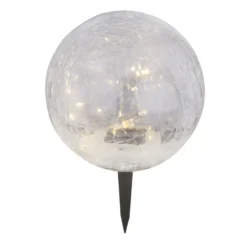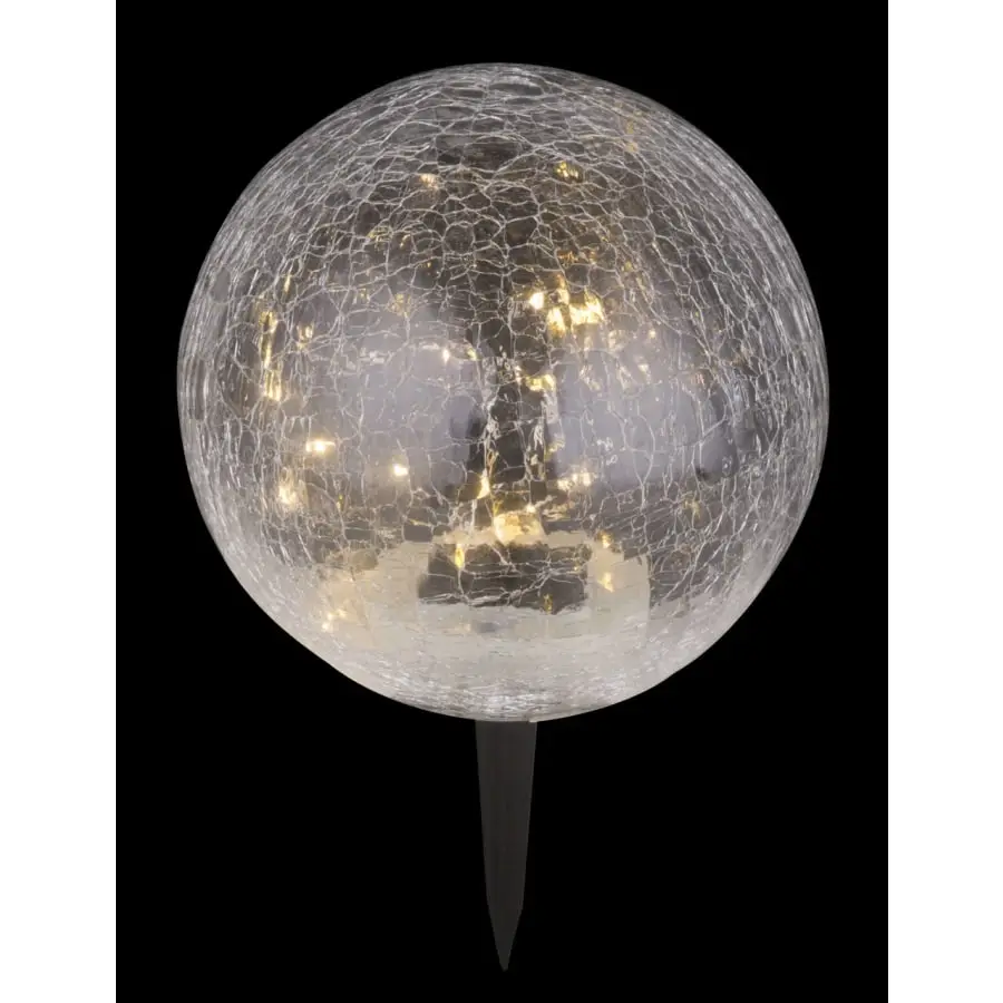 Denna slående sfäriska (Ø 19,5 cm) solcellslampa är gjord av klart sprucket glas och svart plast. Du kan fästa den i marken med det medföljande markbenet. Denna solcellslampa har en på/av-knapp och är fullt lämpad för utomhusbruk tack vare IP44-skydd. Det inbyggda batteriet lyser upp LED-ljuskällorna (20 x 0,06 W) i upp till sex timmar med spännande ljus.