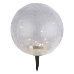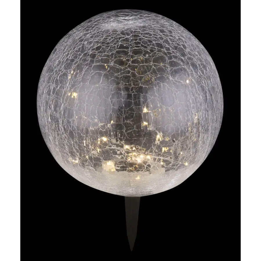 Denna slående sfäriska (Ø 25 cm) solcellslampa är gjord av klart sprucket glas och svart plast. Du kan fästa den i marken med det medföljande markbenet. Denna solcellslampa har en på/av-brytare och är fullt lämplig för utomhusbruk tack vare IP44-skydd. Det inbyggda batteriet lyser upp LED-ljuskällorna (30 x 0,06 W) i upp till sex timmar med spännande ljus.