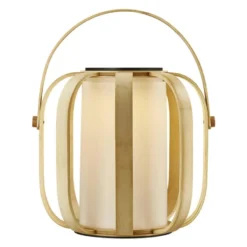 En vacker solcellslykta av bambu och plast, vars ljus tänds automatiskt i skymningen.