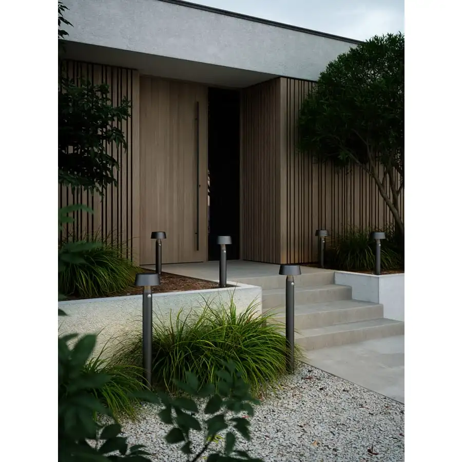 En pollare i aluminium och plast med skymnings- och rörelsesensor som fungerar med en solcell.
