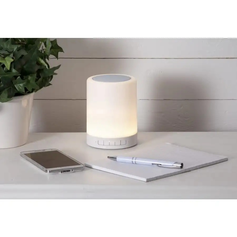 En behändig liten bluetooth-högtalare som är lätt att ta med sig till till exempel trädgården eller stranden. Samtidigt är högtalaren också ett LED-ljus, från vilket du kan välja vitt ljus med olika ljusstyrka, eller ett färgläge. Tillgängliga färger är röd, grön, blå, lime, ljusblå, mjuka växlande färger och rytmisk blinkning. När ljuset är i blinkande läge och musik spelas, kommer färgerna att ändras enligt musikens rytm.