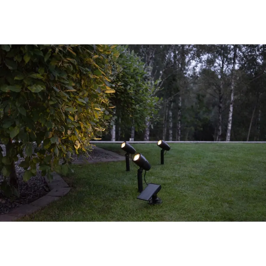 En tredelad spotlight-serie som fungerar med en solcell, som lämpar sig för att belysa exempelvis träd och planteringar. Lamporna tänds när det blir mörkt